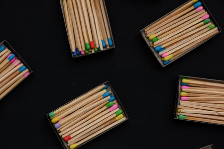 multicolored match sticks in boxes on a black background