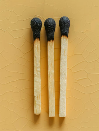 Three Burned Matches Aligned on Cracked Yellow Background Symbolizing Burnout, Exhaustion, and Stress AI Generative