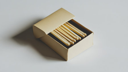 This image features a simple matchbox filled with wooden matches, arranged neatly against a clean white background, highlighting the utility and simplicity of everyday lighting tools.