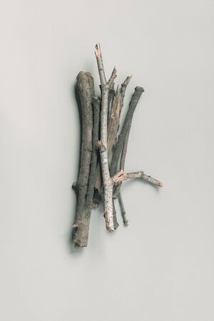 Pile of dry twigs on white background