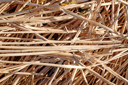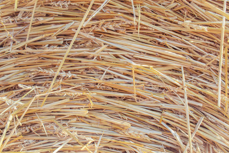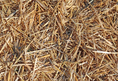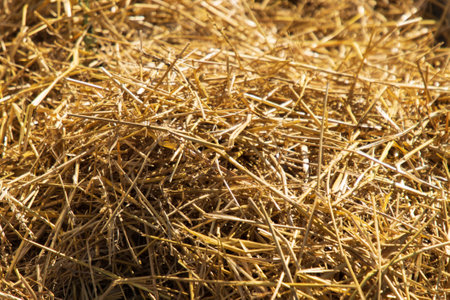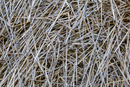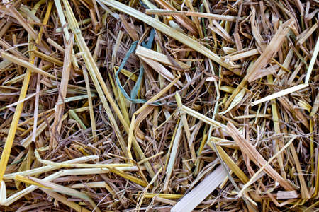 Rural agriculture objects and details concept. Detailed closeup dry of scattered hay