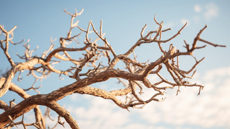 Dry tree stands alone against a pale blue sky, its brittle branches creating a dramatic silhouette