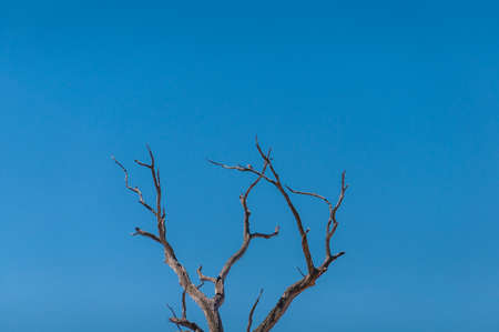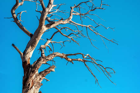 Dry dead eucalyptus tree branches against blue sky on the background. Drought and climate change concept