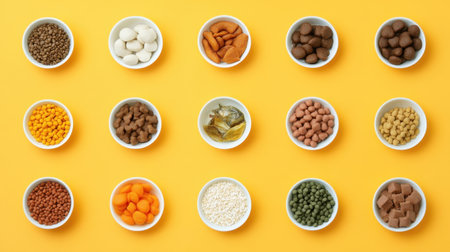 A vibrant display of various spices and ingredients arranged in small bowls against a bright yellow background, perfect for culinary and food photography projects showcasing color and texture.