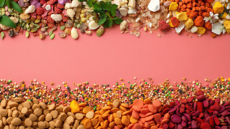 This image showcases a vibrant assortment of dried spices and herbs beautifully arranged on a pink surface, enhancing culinary creativity and visual appeal.