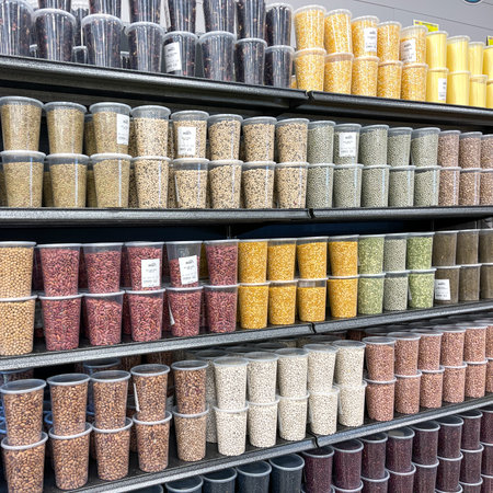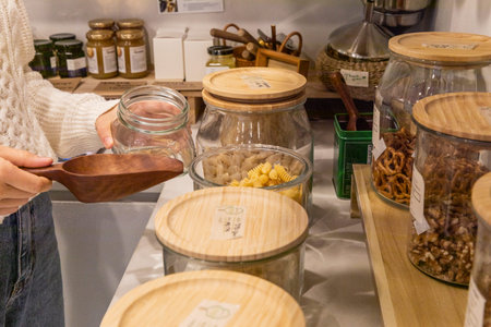 Eco-friendly zero waste shop. Dispensers for cereals, nuts and grains in sustainable plastic free grocery store. Bio organic food. Shopping at small local businesses. New trend alternative buying.