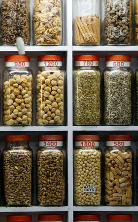 Athens, Greece - September 22, 2017: Delicious spices, herbs, cereals and traditional Greek specialities can be bought at the shop on Evripidou Street. Commercial centre of Athens.