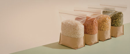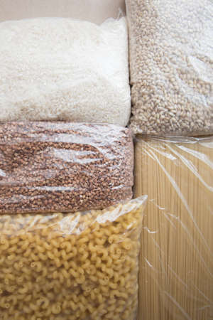 Food donations on a beige background, Cereals and pasta in transparent bags. vertical orientation.