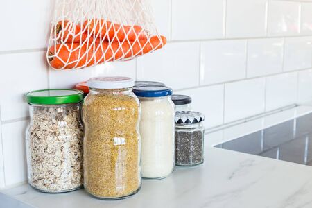 Different food in reused glass jars and a mesh bag on the kitchen, zero waste plastic free concept, copy space