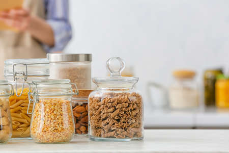 Close up of cereals in cans on shelf. Raw pasta products in glass jars in kitchen