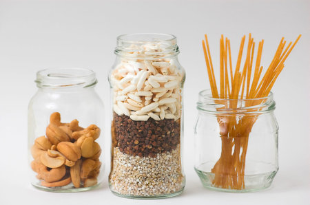 Stocked kitchen pantry. Shelves with different cereals in jars on white wall background with space for text. Different seeds and cereals in glass containers. Food storage