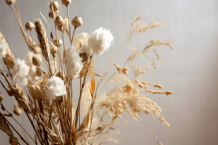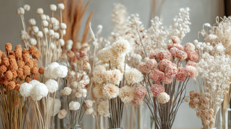 Dried flowers in soft hues of cream and brown are displayed artistically against a light neutral background, creating a serene and inviting ambiance in the room..