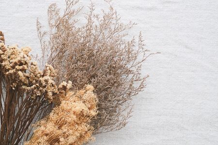 Beautiful dry flowers for interior decoration on brown fabric background.
