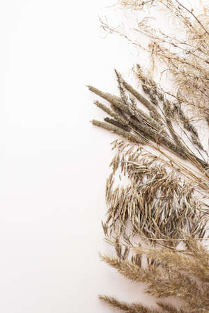 Bouquet of field dried grass on a white background. Rustic vintage hipster style. View from above