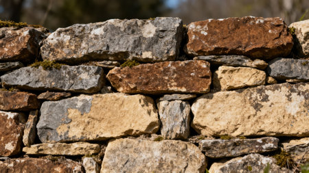 A close-up view of a weathered stone wall showcasing a variety of textures and colors.