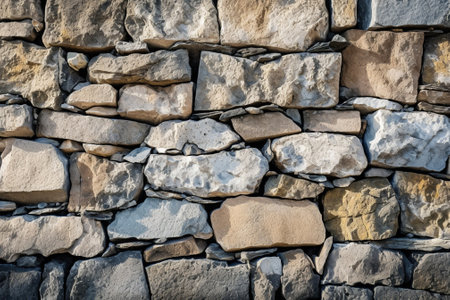 A close view of an old stone wall featuring uneven blocks and visible mortar lines, illustrating age and craftsmanship in construction