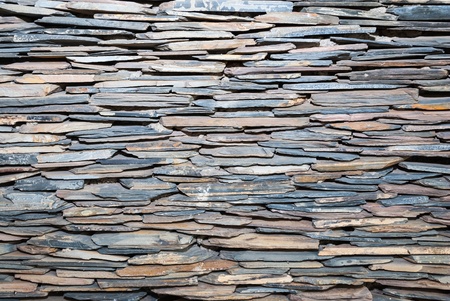 Detailed texture of a dry stone wall featuring layered grey and brown slate with visible gaps.
