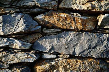 An image captures a textured arrangement of grey stone blocks under a warm sunset glow. The composition showcases the rugged details and weathered surface of the stones. The lighting creates a contrast between light and shadow. Suitable for illustrating natural settings or backgrounds for various commercial projects.