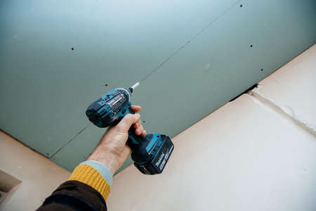 The worker attaches plasterboard on metal frame. Installation of ceiling.