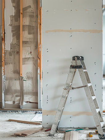 Repairman with a ladder in the interior of a new apartment