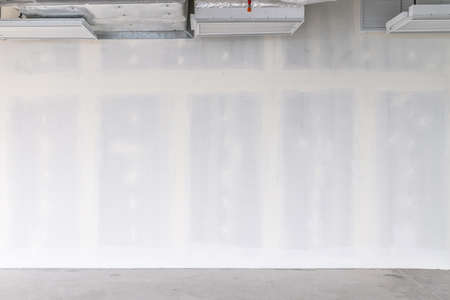 Drywall background during interior renovation with open ceiling system work. Drywall is gypsum wall with joints at the building site. Empty space for developer investment.