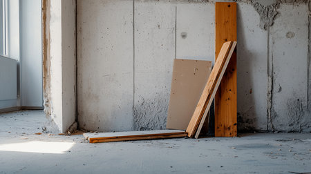 A collection of wooden planks and boards are propped against a textured wall, indicating ongoing construction or renovation work in a room.