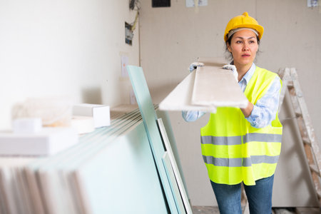 Woman builder in protective helmet and yellow vest carries drywall on shoulder