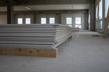 drywall panels are lying on the floor of a factory building on a construction site