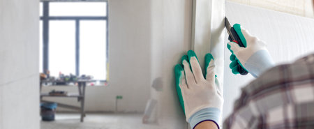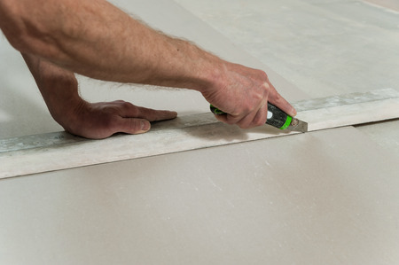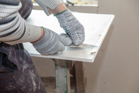 Worker cuts with a knife drywall repair.