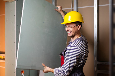 Builder with plasterboard in new building interior