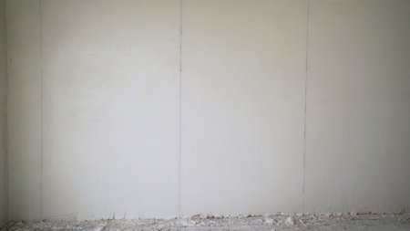 White wall with subtle plaster residue on the floor, creating a minimalist and modern interior design concept