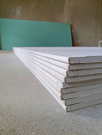 A close-up view of stacked drywall sheets in a construction site highlights the raw materials used for interior walls, surrounded by tools and light.