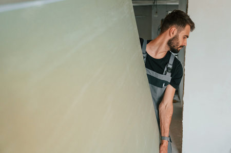 Moving big part of construction material by hands. The man is making repairs in the apartment.