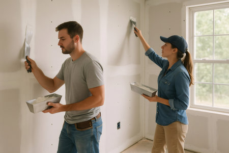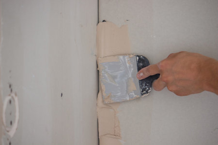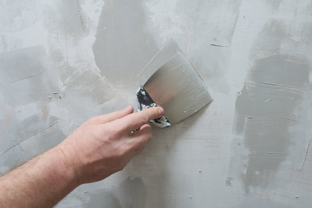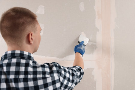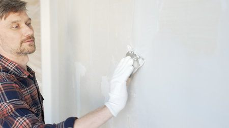 Handyman plastering a beige wall with a putty knife, enhancing the home through renovation and repair work in a residential setting