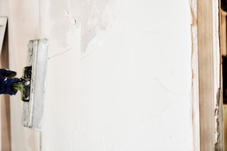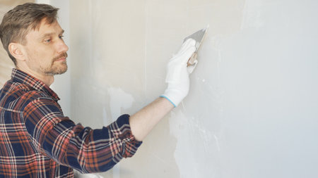 Professional craftsman applying plaster with a trowel, home renovation concept