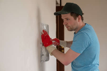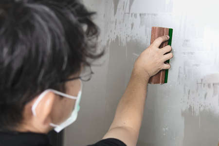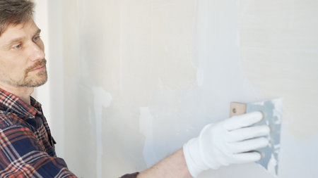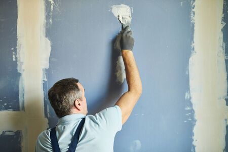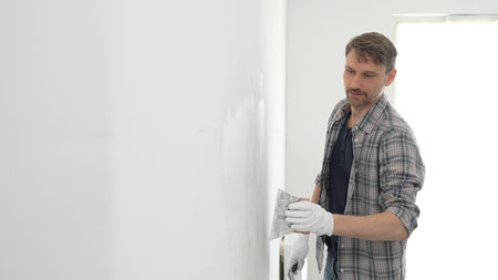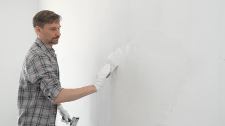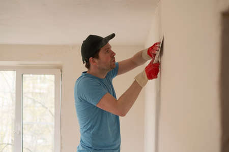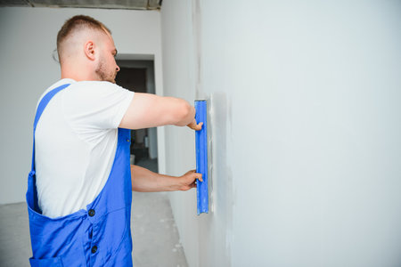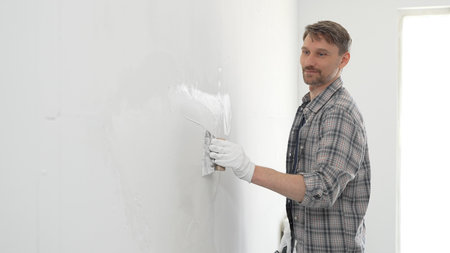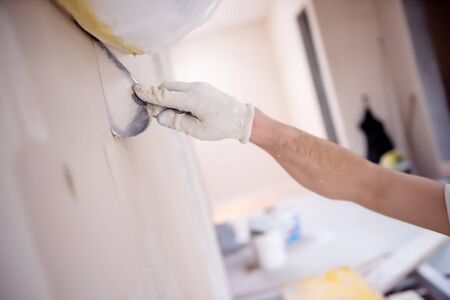 Construction worker man wearing gloves and holding a putty knife is applying plaster on a white wall, performing home renovation and improvement