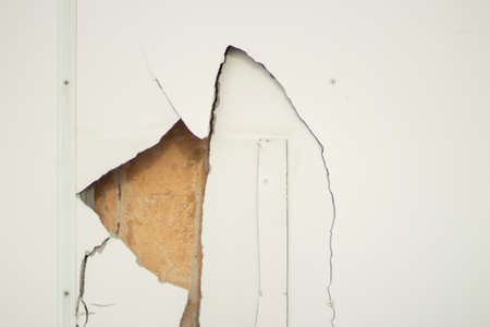 Hole in the wall. Broken surface. Cracked wall panel. A hole punched in the wall. Vandalism and the consequences of hitting the wall.