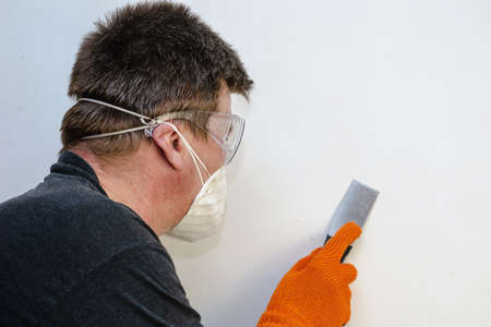 A man is puttying an interior wall. An adult man wearing safety glasses, red gloves, and a respirator is holding a metal trowel. Repair services. Construction industry. Indoors.