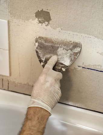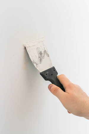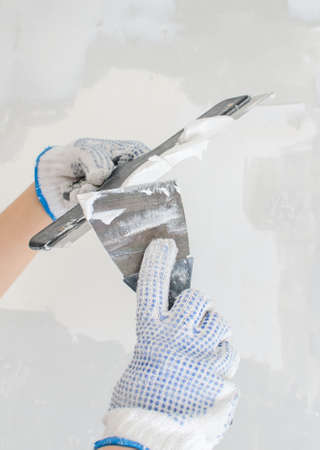 Hand with putty knife repair wall, Hand with a spatula, spatula with spackle paste structure, process of applying layer of putty trowel, working with spackling paste