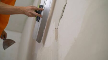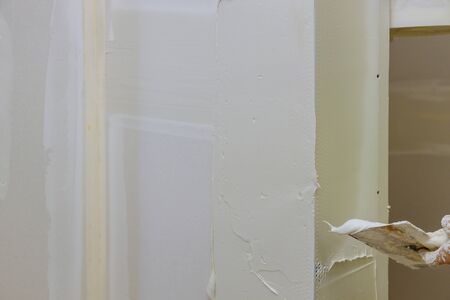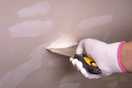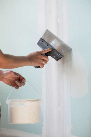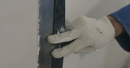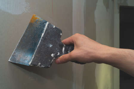 Worker puttied wall using a paint spatula hand worker repairs gypsum plasterboard