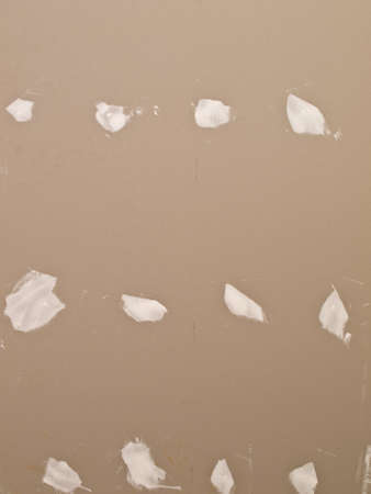 Front view of brown gypsum boards installed on the partition wall of building under construction at the construction site.