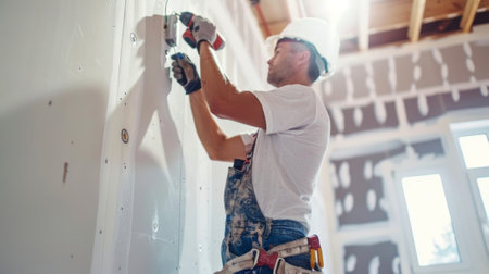 Construction worker spreading plaster on white wall, wearing protective gloves and t-shirt during home renovation project, working with professional skill and focus