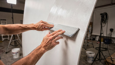 Medium shot of hands applying a matte coating onto a cyc surface to enhance projection clarity with blurred workshop elements behind.
