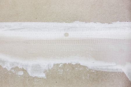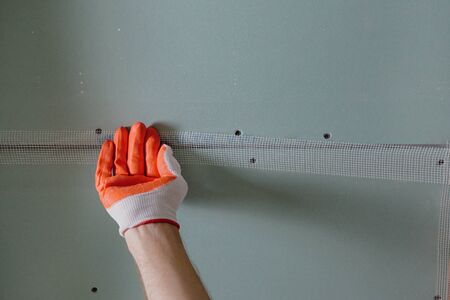 Preparing drywall for plastering. The drywall joint is filled and reinforced with reinforced tape.