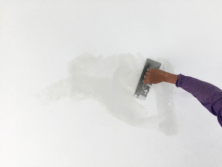 Builder using a trowel to add plaster to a white wall during repairs for a damp area caused by water leakage or moisture