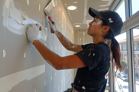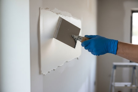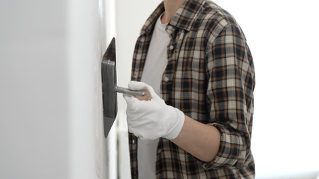 Construction worker wearing gloves and using a putty knife to plaster a white wall, performing home renovation and improvement tasks with precision