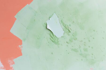 close up damaged walls with peeling paint and plaster and small nail or screw heads in the exposed areas