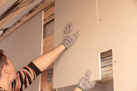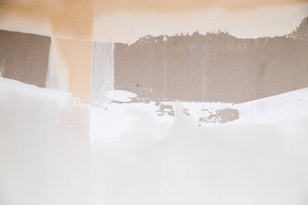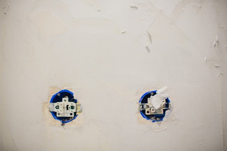 The wall is partially plastered, made of drywall. Preparing to install the outlet. Background with space to copy. High quality photo