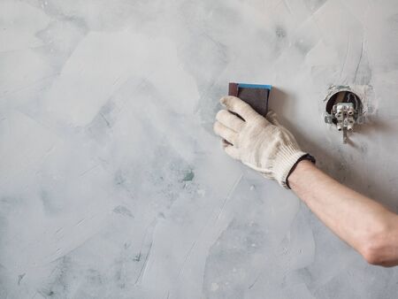 Close-up of a man's hand with a spatula. Repair and construction. Plastering walls. Copy space.