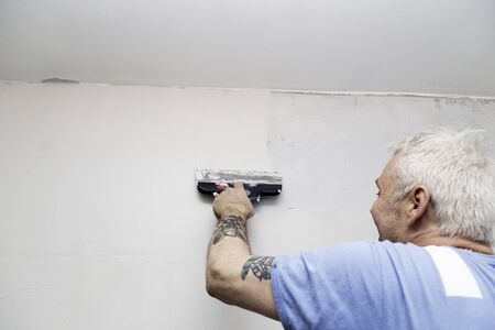 man with a spatula. gray-haired man makes repairs at home. alignment of walls. wholesale developer. back view. Man plastering wall with putty-knife, close up image. Fixing wall surface and preparation for painting